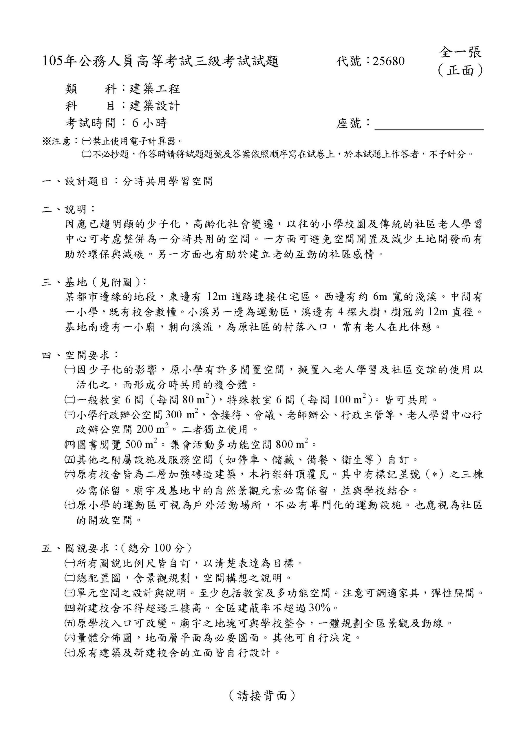 2021年8月4日 【105年高考三級】分時共用學習空間 因應已趨明顯的少子化,高齡化社會變遷,以往的小學校園及傳統的社區老人學習中心可考慮整併為一分時共用的空間。一方面可避免空間閒置及減少土地開發而有助於環保與減碳。另一方面也有助於建立老幼互動的社區感情。 完整題目下載 ← 返回文章列表