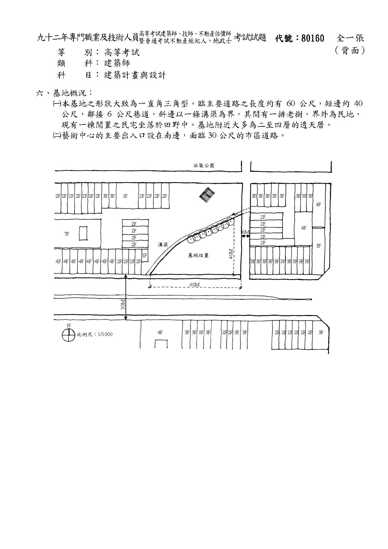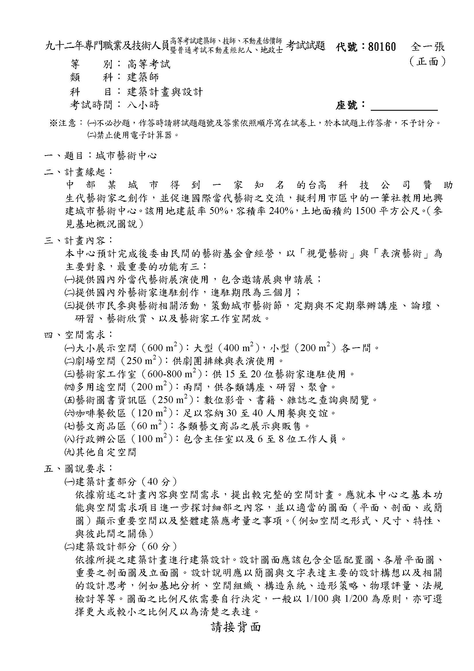 2021年8月4日 【92年專技建築】城市藝術中心 一、題目:城市藝術中心二、計畫緣起:中 部 某 城 市 得 到 一 家 知 名 的台高 科 技 公 司 贊 助生代藝術家之創作,並促進國際當代藝術之交流,擬利用市區中的一筆社教用地興建城市藝術中心。該用地建蔽率50%,容積率240%,土地面積約1500 平方公尺。(參見基地概況圖說) 完整考題下載 ← 返回文章列表