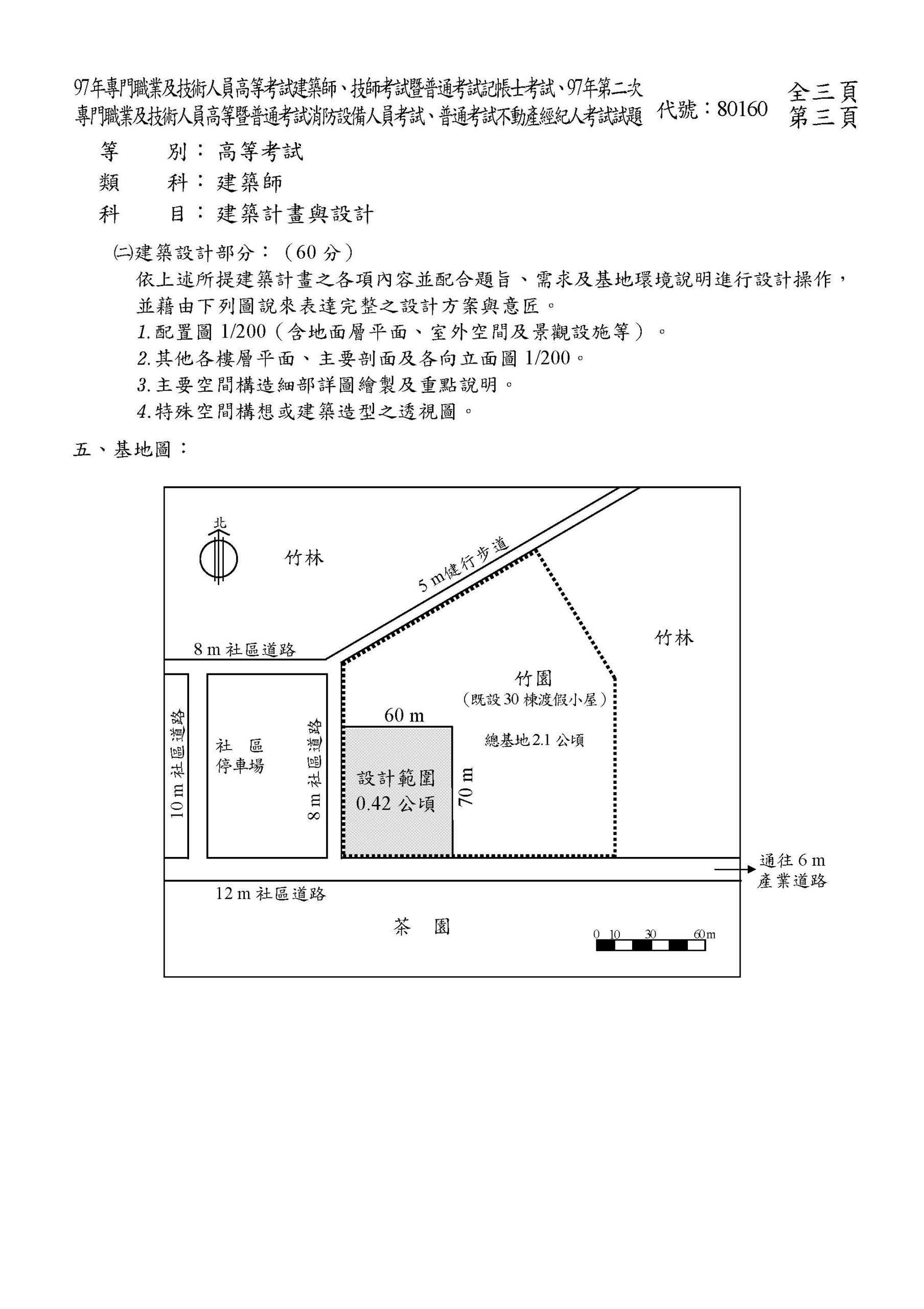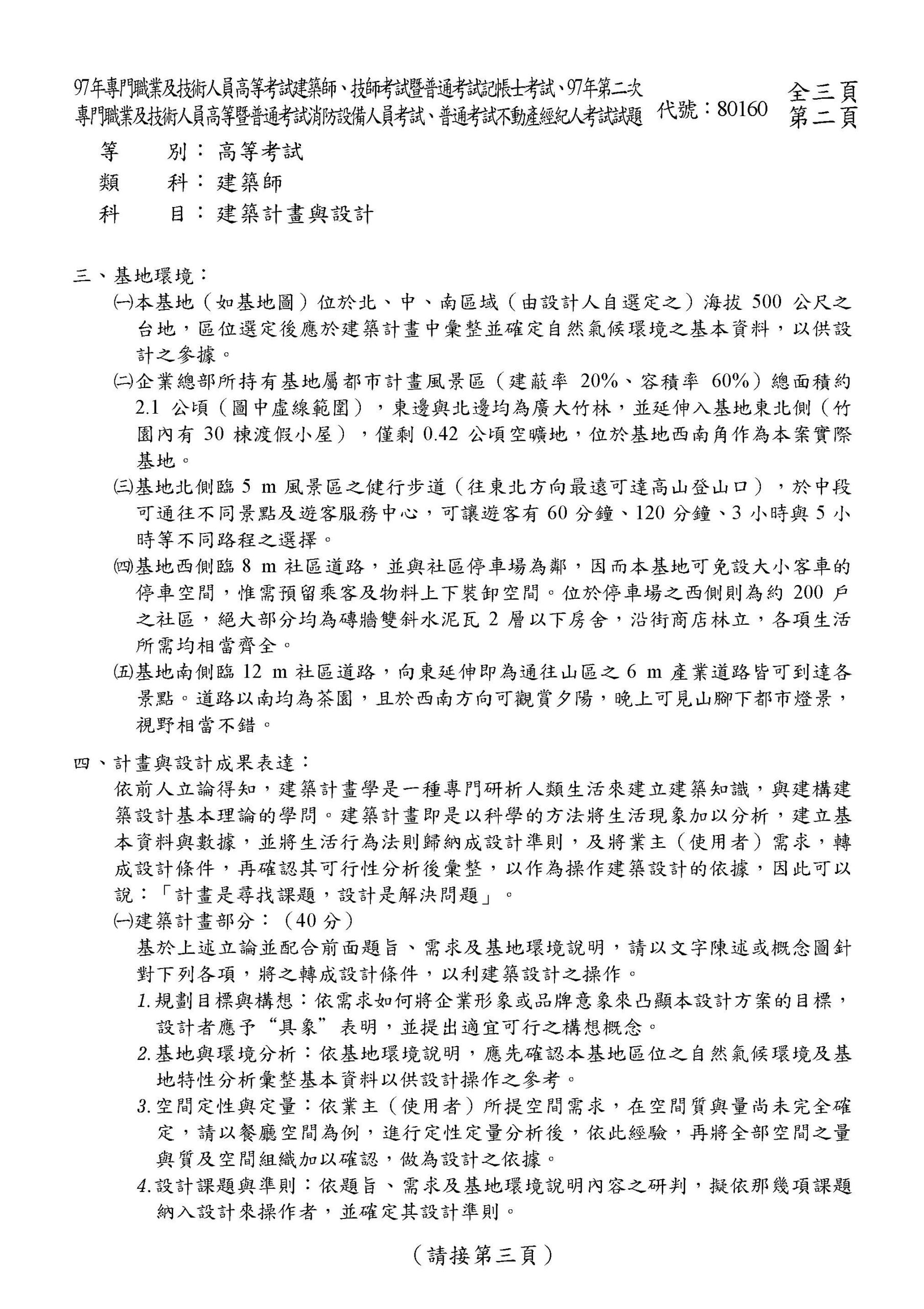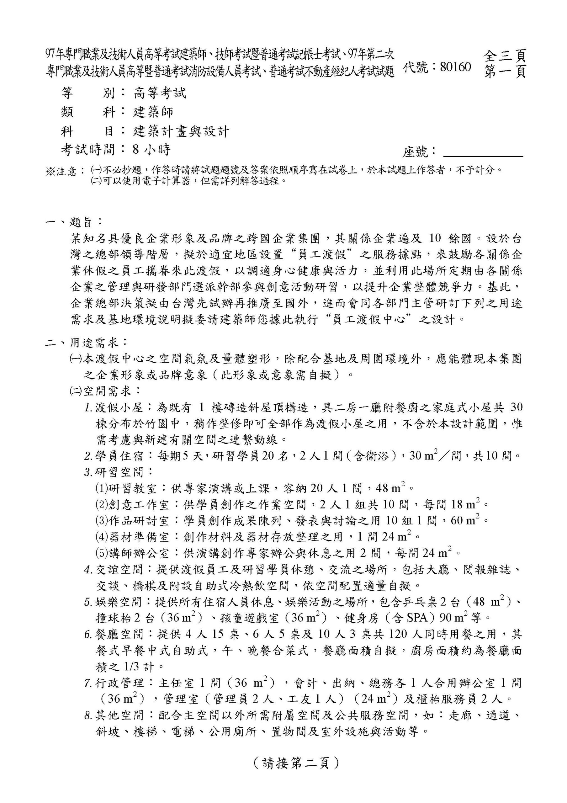 2021年8月4日 【97年專技建築】跨國企業員工渡假中心 某知名具優良企業形象及品牌之跨國企業集團,其關係企業遍及 10 餘國。設於台灣之總部領導階層,擬於適宜地區設置“員工渡假”之服務據點,來鼓勵各關係企業休假之員工攜眷來此渡假,以調適身心健康與活力,並利用此場所定期由各關係企業之管理與研發部門選派幹部參與創意活動研習,以提升企業整體競爭力。基此,企業總部決策擬由台灣先試辦再推廣至國外,進而會同各部門主管研訂下列之用途需求及基地環境說明擬委請建築師您據此執行“員工渡假中心”之設計。 完整考題下載 ← 返回文章列表