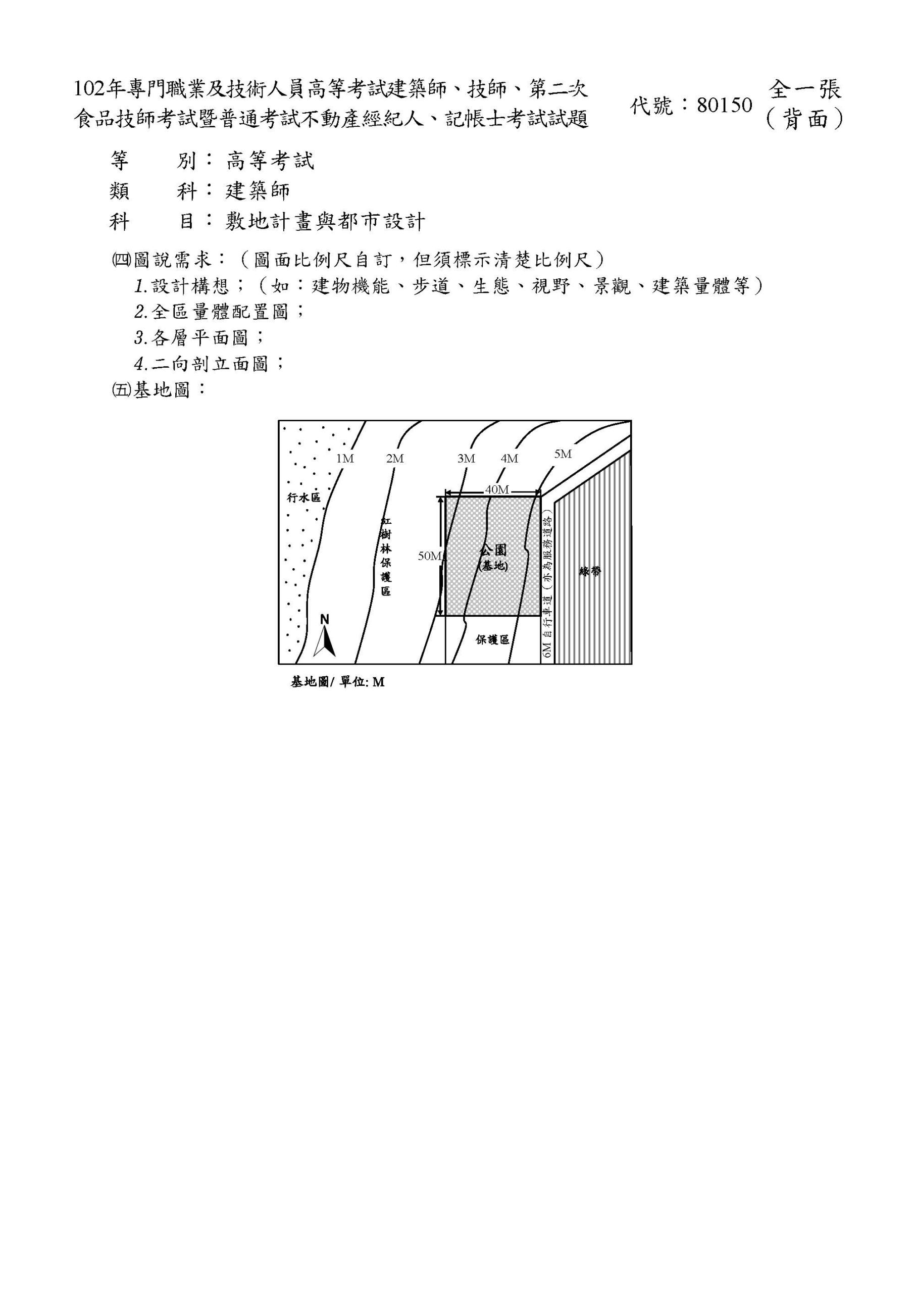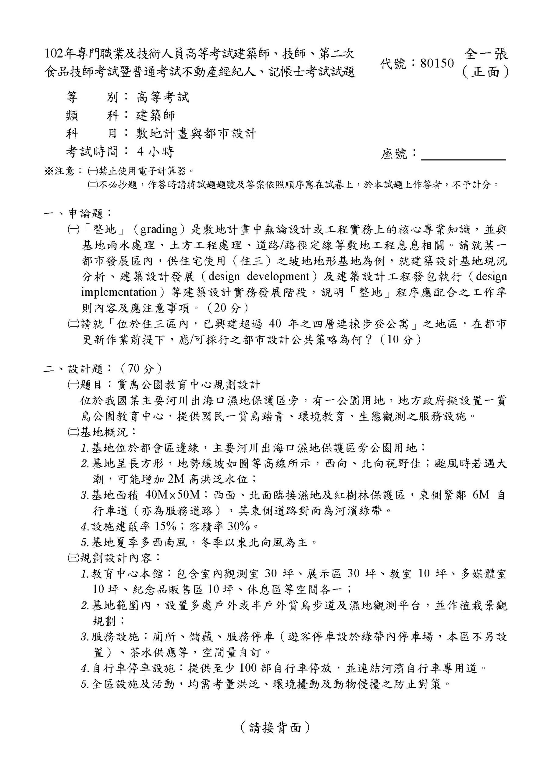 2021年8月4日 【102年專技敷地】賞鳥公園教育中心規劃設計 位於我國某主要河川出海口濕地保護區旁,有一公園用地,地方政府擬設置一賞鳥公園教育中心,提供國民一賞鳥踏青、環境教育、生態觀測之服務設施。 完整題目下載 ← 返回文章列表